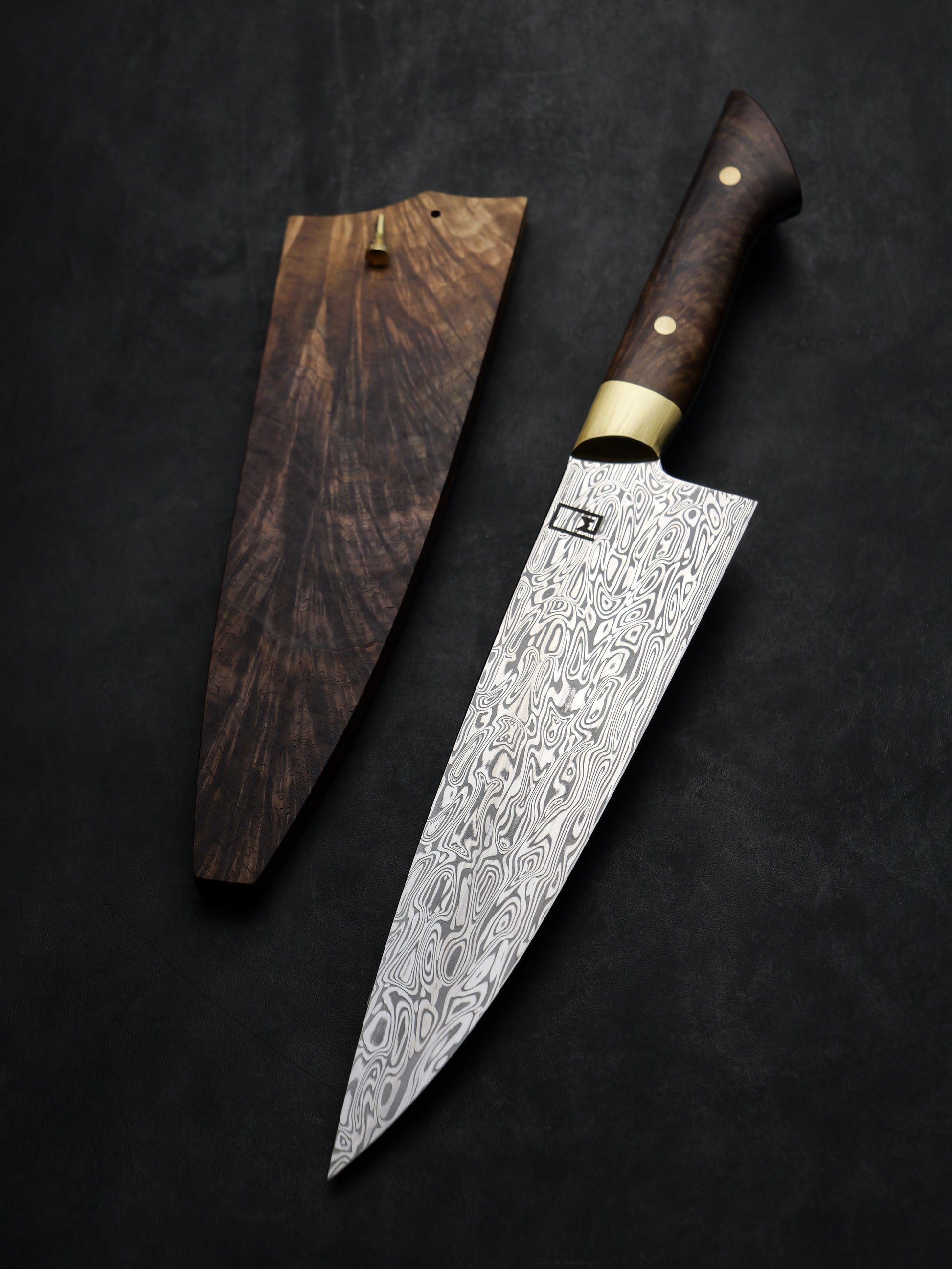 This chef's knife features a stainless Damascus steel forged by Damasteel in Sweden using their "Loki" pattern. The handle is crafted from stabilized locally harvested walnut with brass bolsters. This knife comes with a matching figured walnut saya.