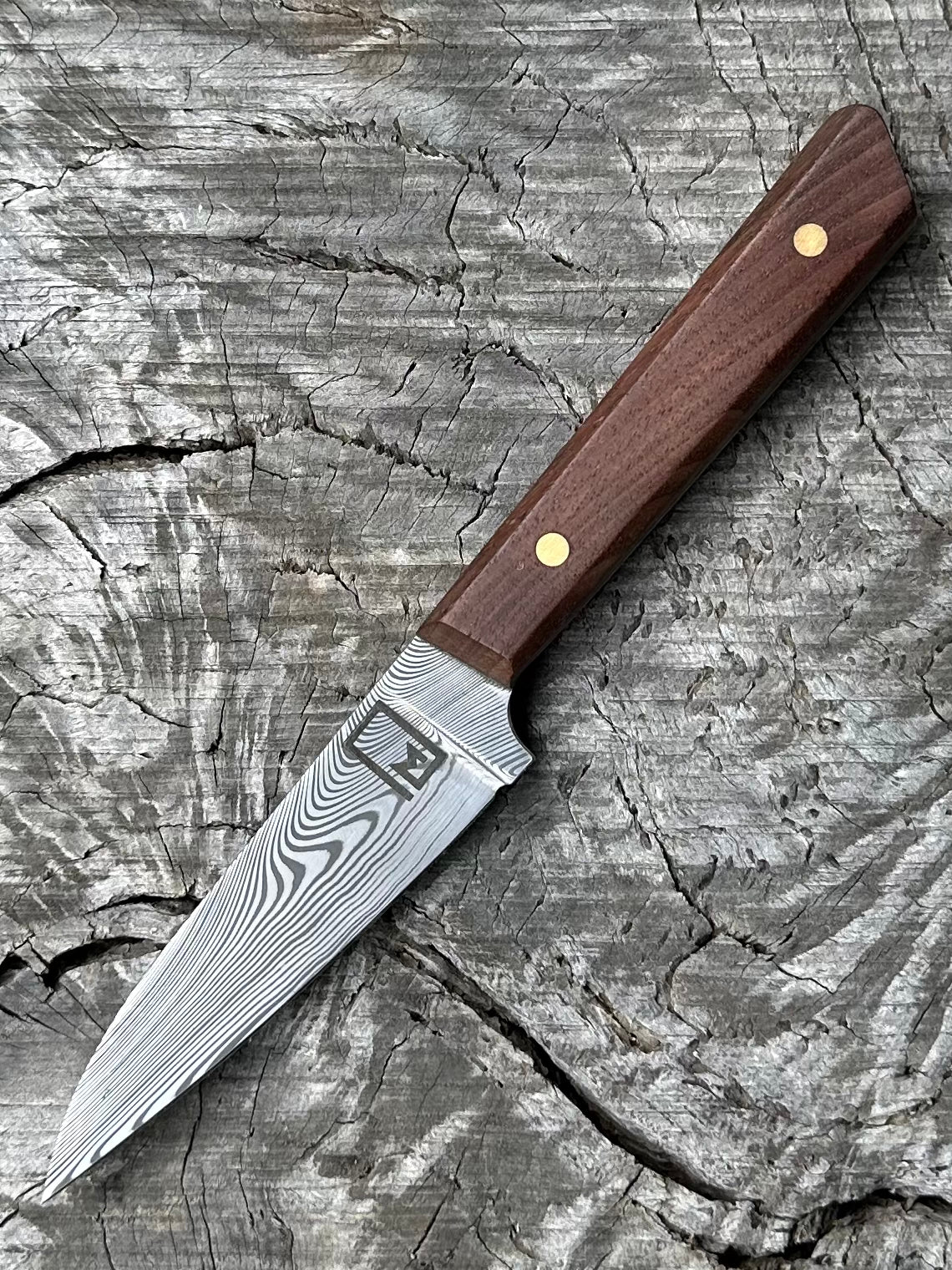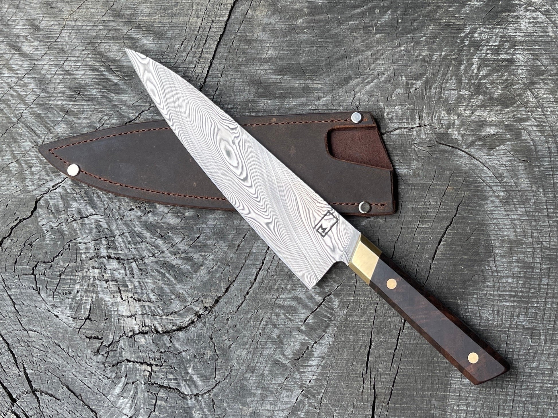 This series fuses the performance and geometry of an Eastern-inspired blade profile with the comfort and beauty of a Western style bolster and handle. The set features a handle selection of domestic walnut sourced from Zack's farm in Charlottesville, Albemarle County, VA.