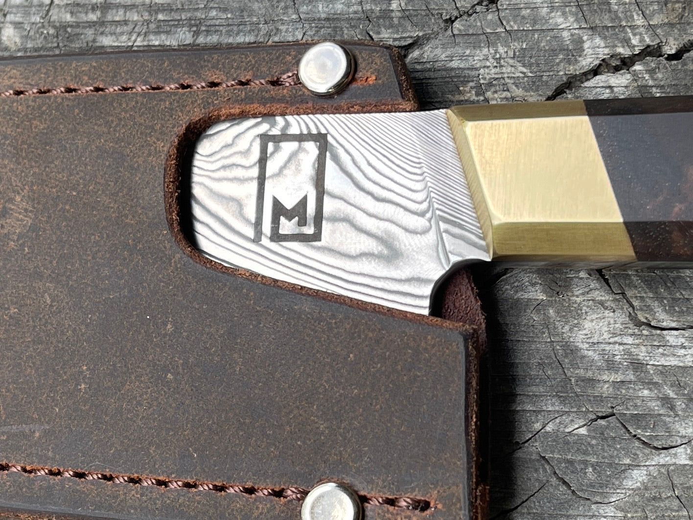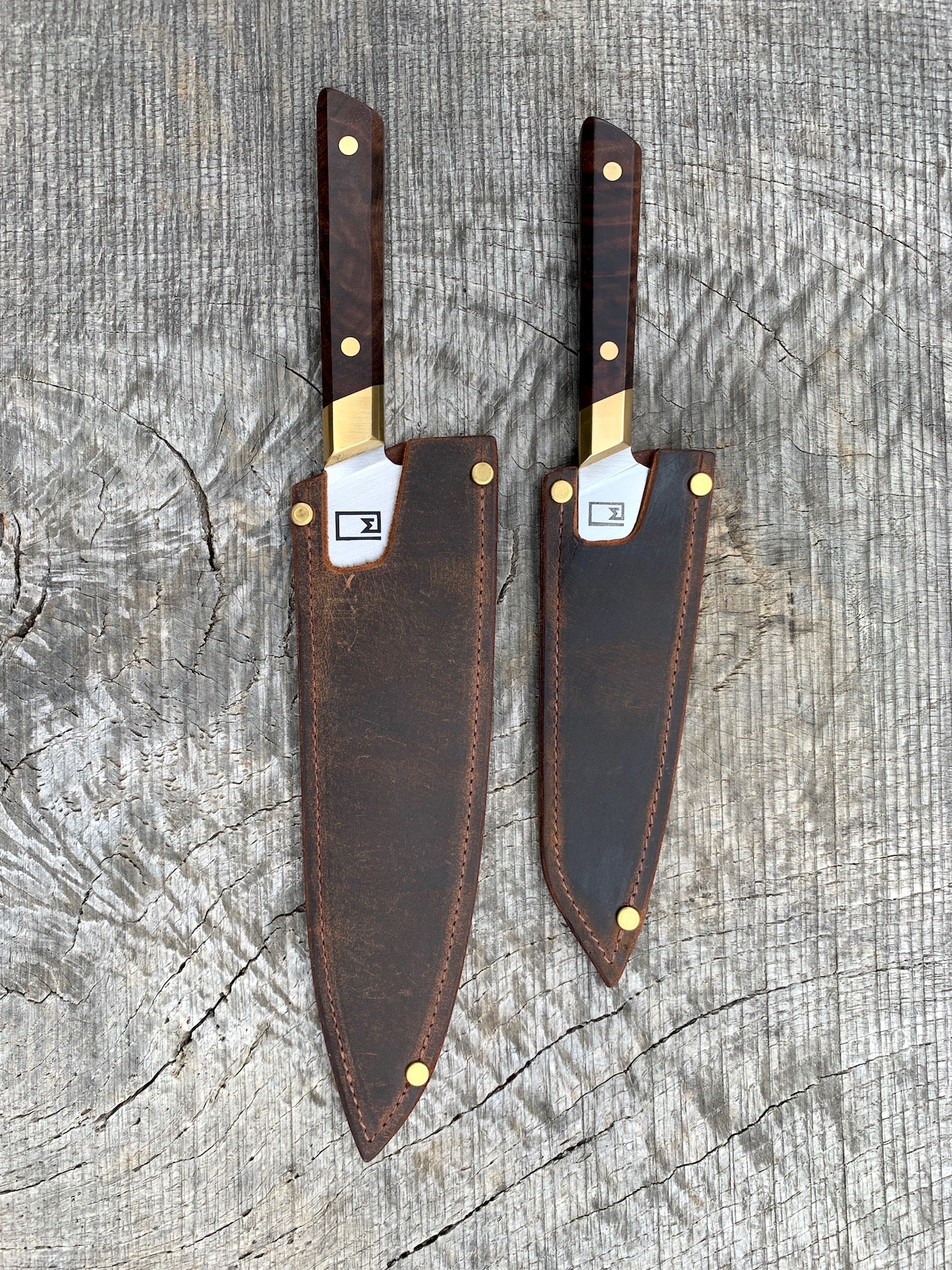 The larger two with matching custom leather sheaths. The hexagon handles are secured with brass corby bolts and bolsters to offer a nice weight for the knife to balance at the pinch point. The sheath is included for traveling with your knife, but should not be used for storage as it will cause rust.